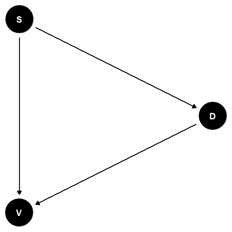 Let’s suppose we are interested in the relationship between disturbance (D) and vegetation diversity (V). We assert that disturbance has a causal effect on diversity such…